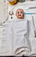 Poco a poco se va recomponiendo la cabeza. lo más complicado es colocar los ojos y que estos tengan movimiento para abrir y cerrar, dado que faltan trozos en el interior y sin ellos los ojos no se mantienen en su sitio.
